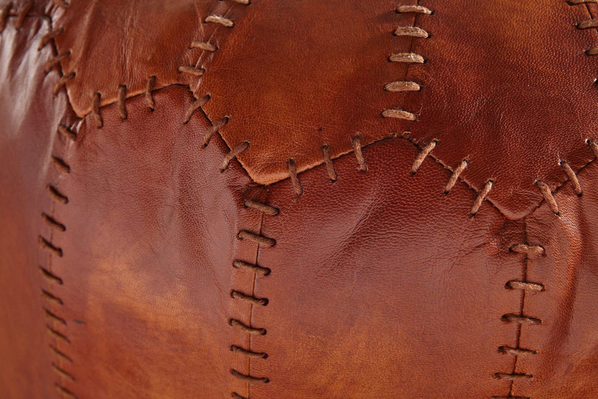 Ce tabouret ottoman rond au design oriental allie esthétique traditionnelle et confort moderne avec un revêtement en cuir véritable de chèvre. Les coutures épaisses accentuent son style unique, tandis que le rembourrage généreux assure une assise agréable.