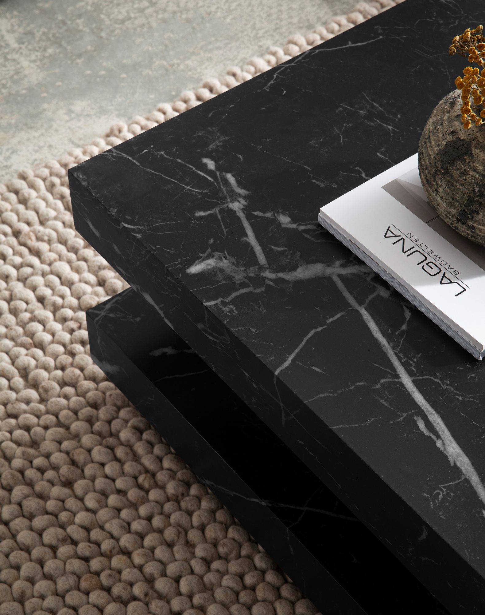 Table basse moderne au design carré, finition mate imitation marbre noir sur MDF folié. Parfaite pour un intérieur élégant, elle offre un espace pratique pour vos effets personnels ainsi qu’un rangement supplémentaire sous le plateau.