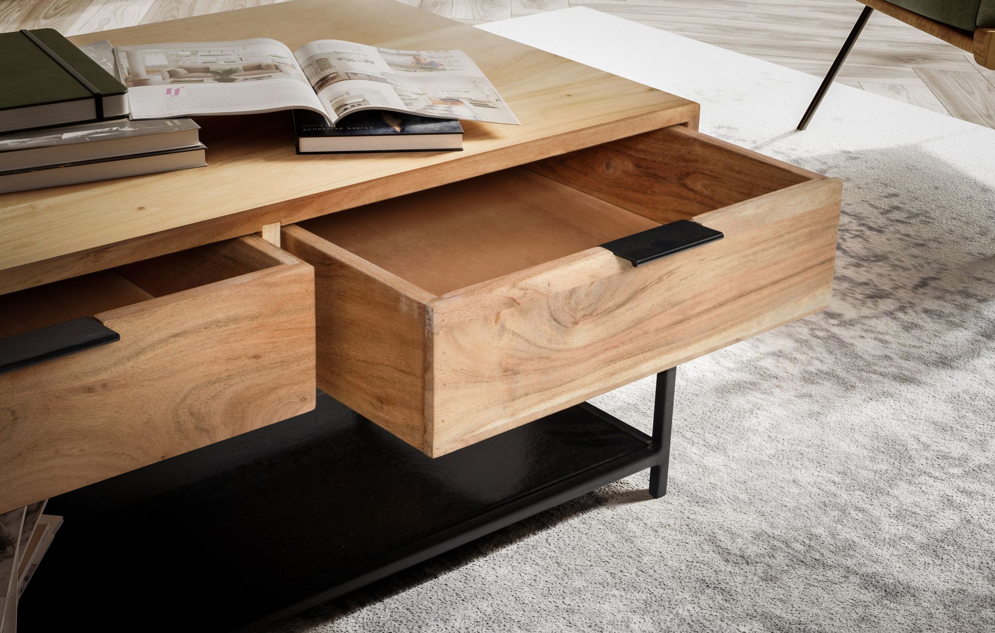 Table basse rectangulaire en bois massif d'acacia noir 90x50x40 cm avec tiroirs | Design moderne