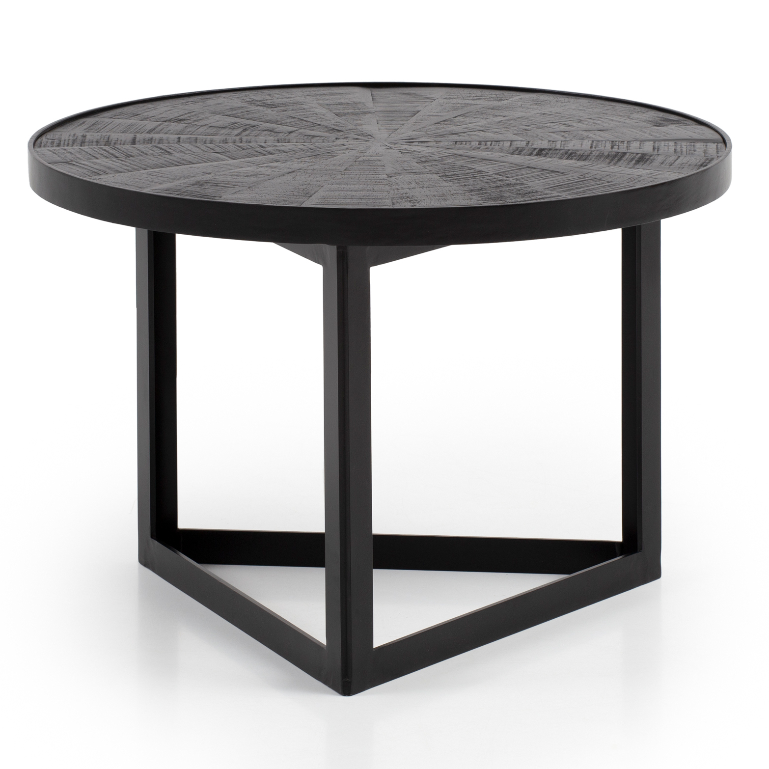 Alliez robustesse et design industriel avec cette table basse ronde en bois massif de mangue et métal noir. Sa structure triangulaire contraste élégamment avec son plateau rond décoré d’un motif en rayon de soleil, pour un salon moderne et unique.